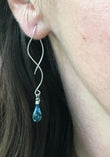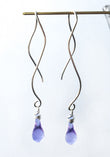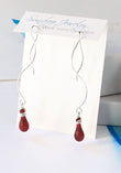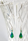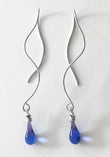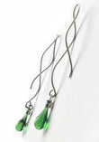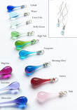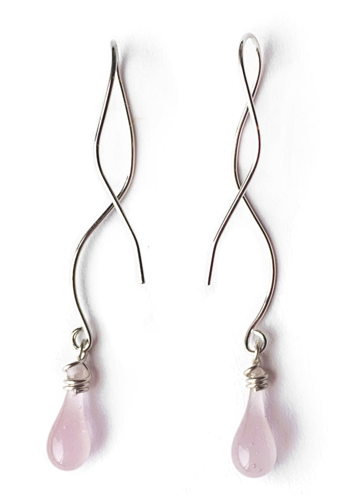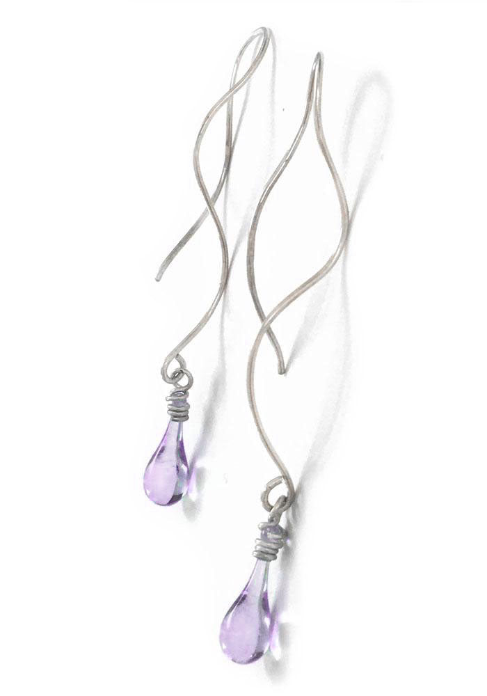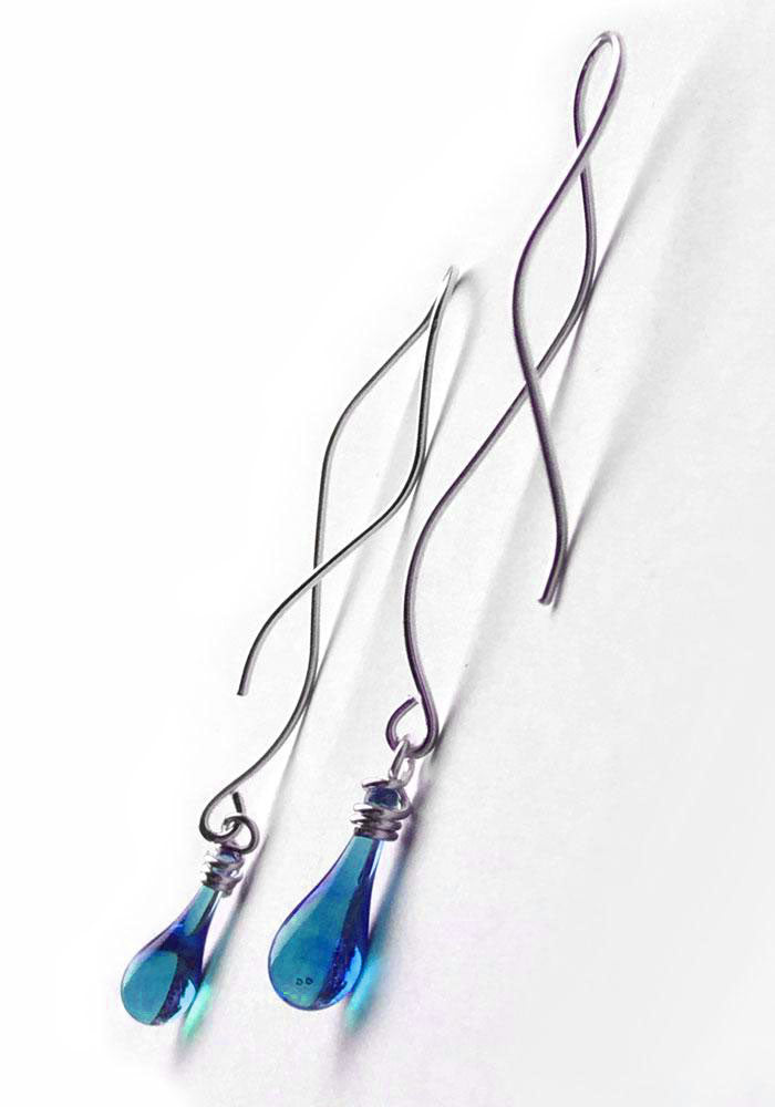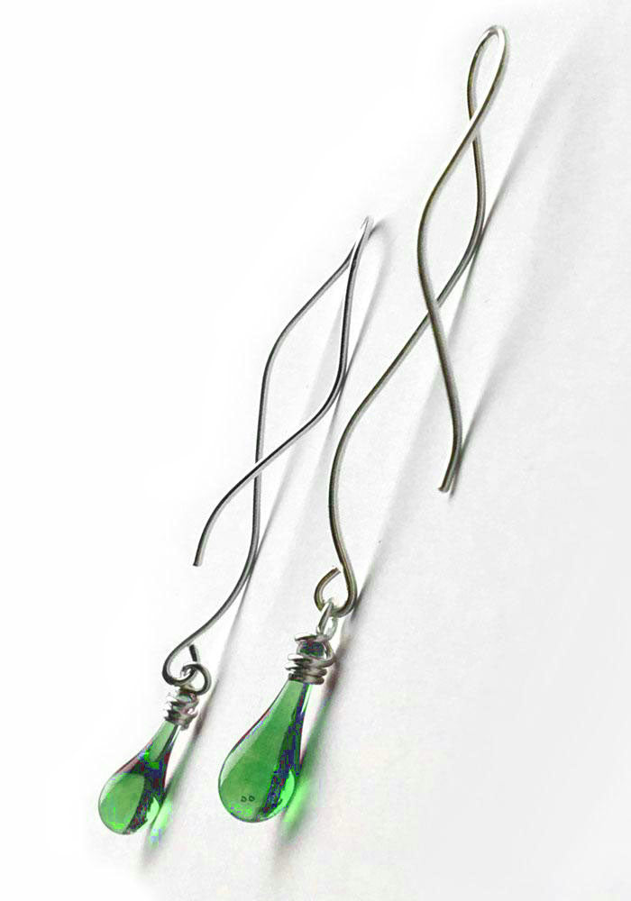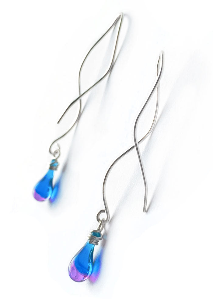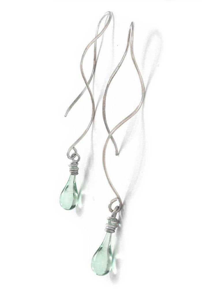 We use stained art glass or recycled bottle glass to make the droplets themselves. All wire and ear hooks are hypo-allergenic sterling silver, and the sterling silver wire is 100% recycled. Necklaces come on sterling silver chain.