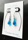 We use stained art glass or recycled bottle glass to make the droplets themselves. All wire and ear hooks are hypo-allergenic sterling silver, and the sterling silver wire is 100% recycled. Necklaces come on sterling silver chain.