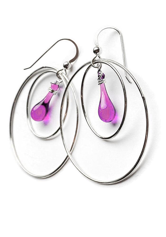 We use stained art glass or recycled bottle glass to make the droplets themselves. All wire and ear hooks are hypo-allergenic sterling silver, and the sterling silver wire is 100% recycled. Necklaces come on sterling silver chain.