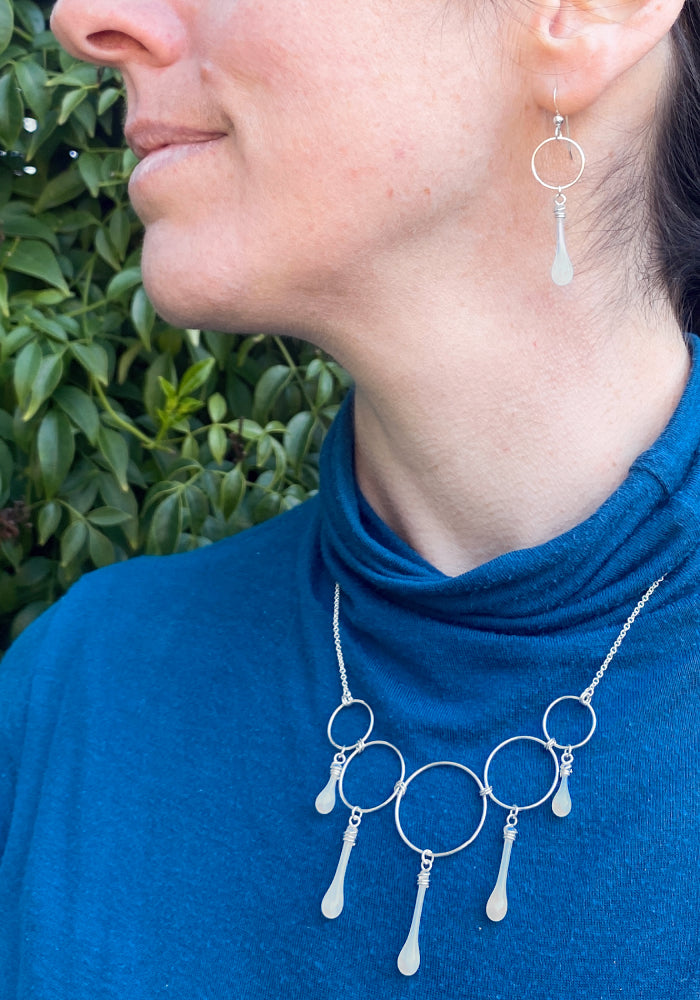 A series of five graduated silver circles join together to bear dainty drips of cloudy white sun-melted glass. Perfect to dress up your daily wear or to add an extra touch of elegance to a night out!