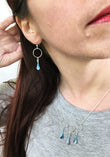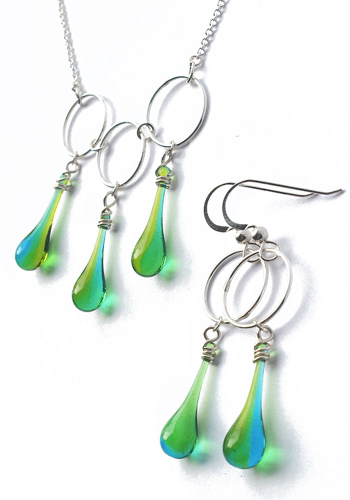 We use stained art glass or recycled bottle glass to make the droplets themselves. All wire and ear hooks are hypo-allergenic sterling silver, and the sterling silver wire is 100% recycled. Necklaces come on sterling silver chain.
