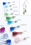 We use stained art glass or recycled bottle glass to make the droplets themselves. All wire and ear hooks are hypo-allergenic sterling silver, and the sterling silver wire is 100% recycled. Necklaces come on sterling silver chain.