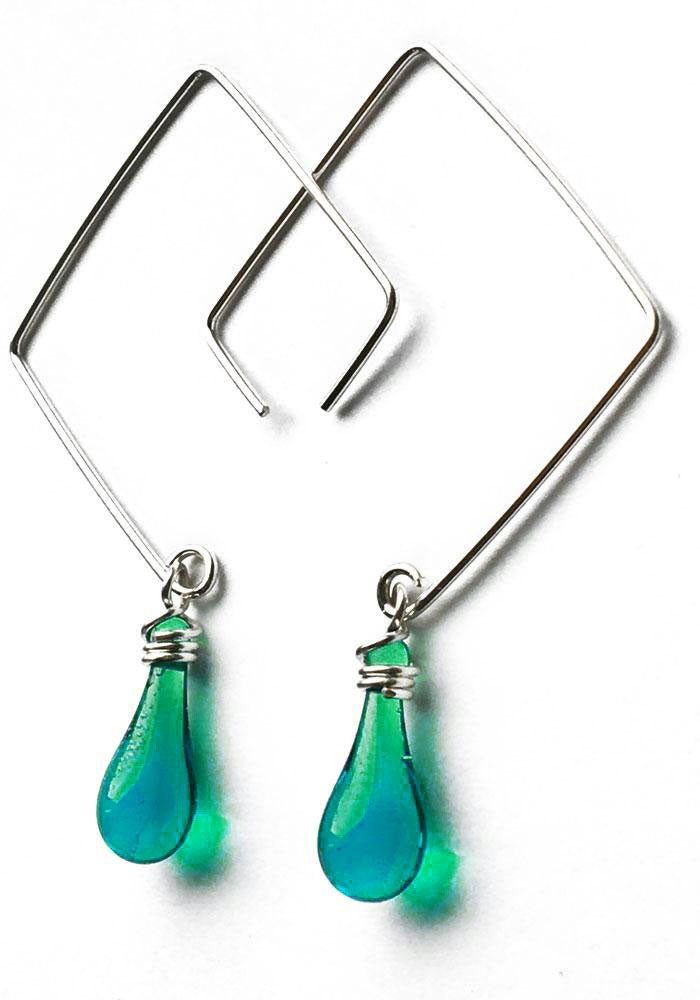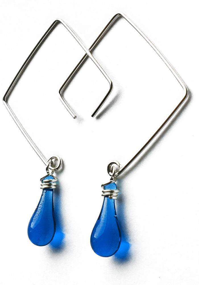 You are unique and original, and your jewelry should be too! Each drop of glass is handmade in the artist’s backyard studio in Berkeley, California. Using a giant magnifying glass to focus sunshine, recycled bottles and stained glass were melted into these translucent, flowing drops under the open sky! No pieces are exactly alike.