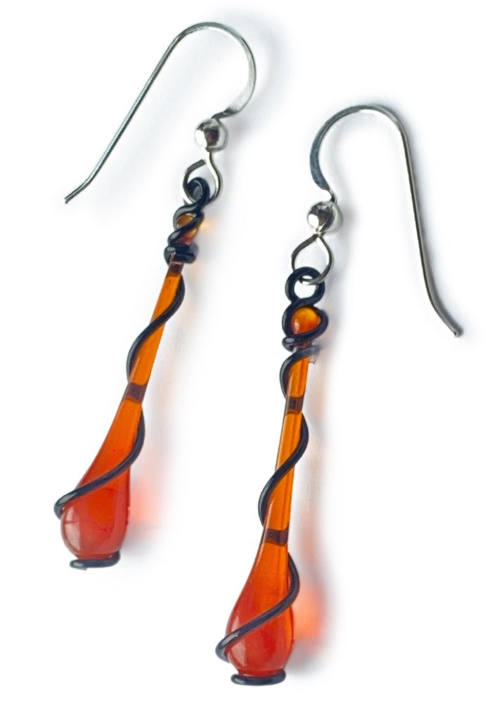 Creeping tendrils of black wire entwine each vibrant drop of sun-melted glass in these Victorian Noir earrings. Whether you want to go gothic with deep garnet red and black, or love the dramatic contrast of black with the transluscent palest green of Coca-Cola, these spiral earrings are designed to make you feel elegant in every situation, from weekend casual to a night on the town.