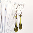 We use stained art glass or recycled bottle glass to make the droplets themselves. All wire and ear hooks are hypo-allergenic sterling silver, and the sterling silver wire is 100% recycled. Necklaces come on sterling silver chain.