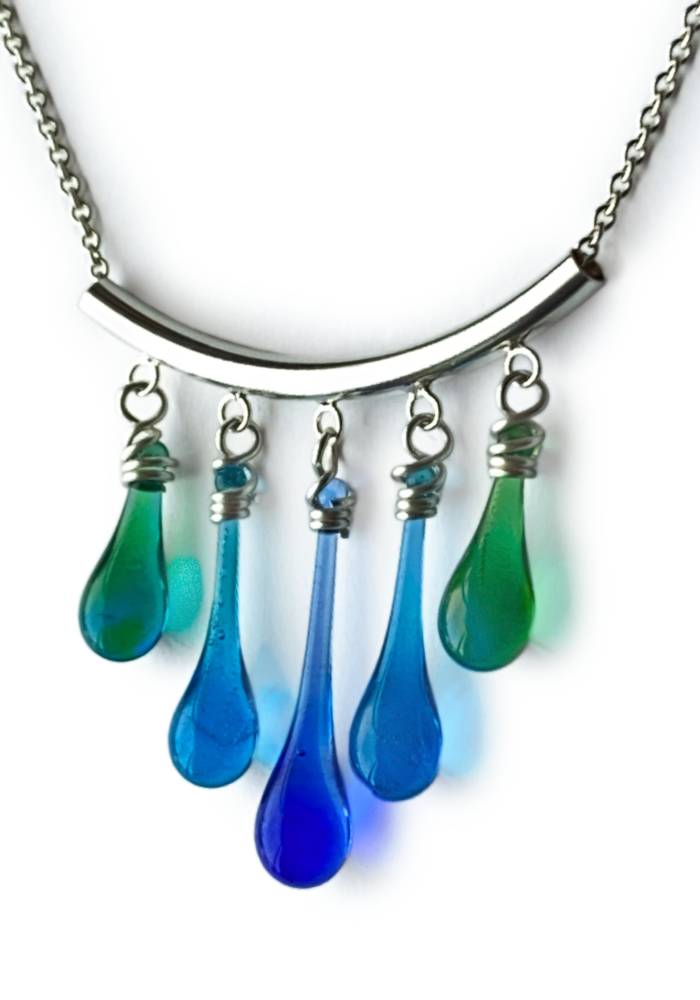 You are unique and original, and your jewelry should be too! Each drop of glass is handmade in the artist’s backyard studio in Berkeley, California. Using a giant magnifying glass to focus sunshine, recycled bottles and stained glass were melted into these translucent, flowing drops under the open sky! No pieces are exactly alike.