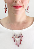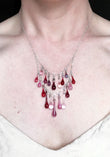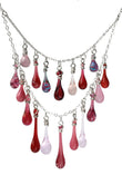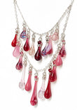 This necklace is dripping with an eclectic cascade of variegated glass droplets in reds, pinks, and purples.