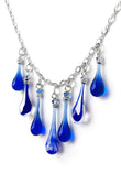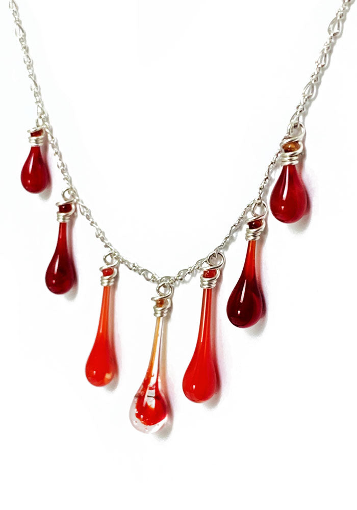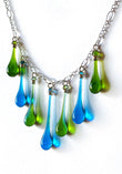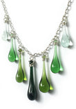 We use stained art glass or recycled bottle glass to make the droplets themselves. All wire and ear hooks are hypo-allergenic sterling silver, and the sterling silver wire is 100% recycled. Necklaces come on sterling silver chain.