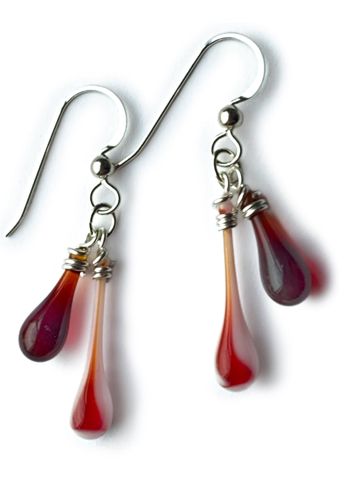 A charming pair of pink and red! These opaque pink earrings have one drop with a dramatic red streak down the side of each glass teardrop, and a shorter droplet of jewel-tone red! More than minimal, less than dramatic, these are everyday earrings you’ll be comfortable wearing anywhere.