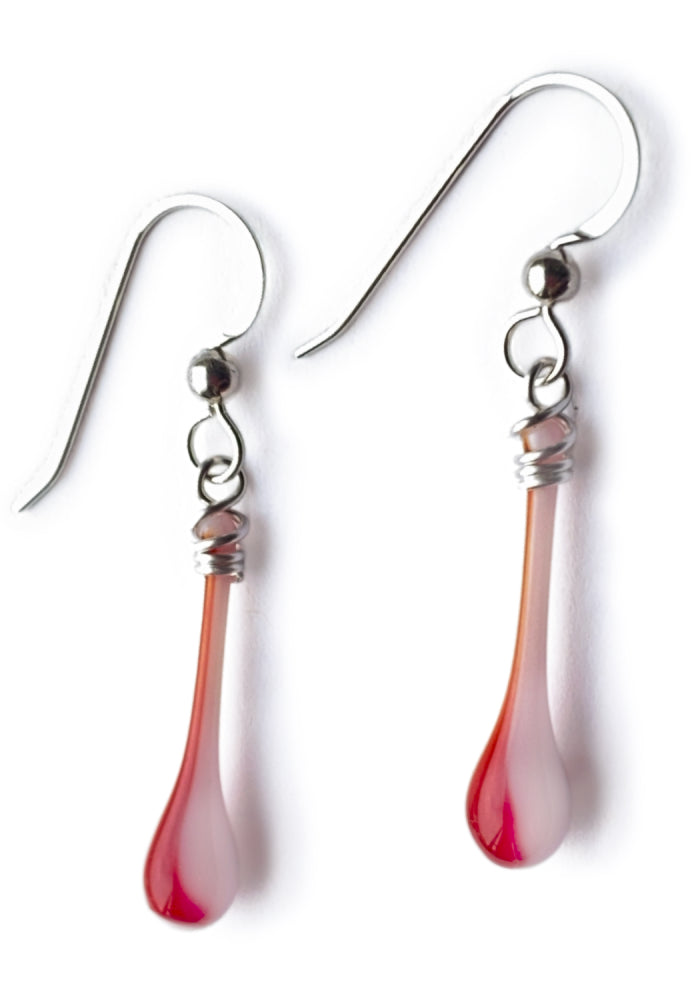We use stained art glass or recycled bottle glass to make the droplets themselves. All wire and ear hooks are hypo-allergenic sterling silver, and the sterling silver wire is 100% recycled. Necklaces come on sterling silver chain.