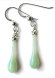 The milky pale green of these simple yet elegant glass earrings evoke the smooth flow of molten glass, frozen forever in an elegant drop of glass. Whether you’re running a few errands or dressing up for an evening, these deceptively simple glass earrings will add the finishing touch to any outfit.