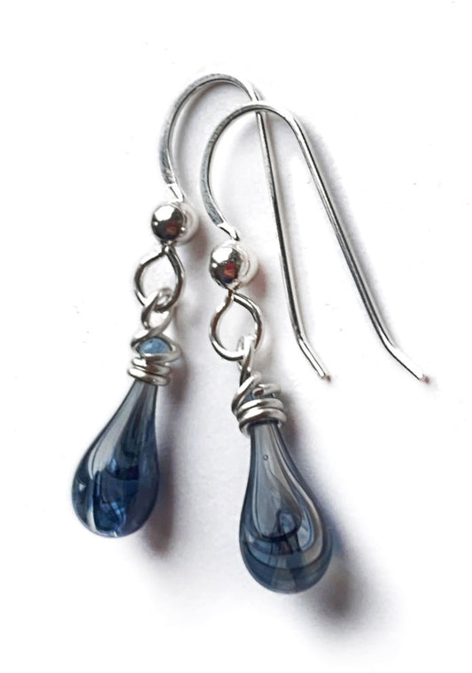 A hazy blue-black swirls within these dainty glass earrings, like smoke from a fall campfire, frozen forever in an...