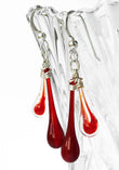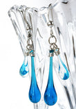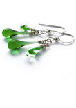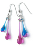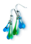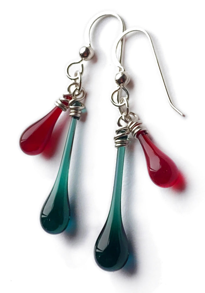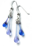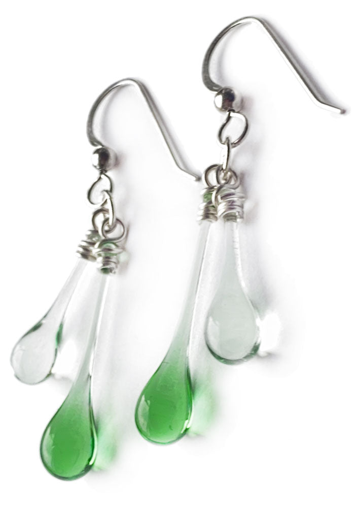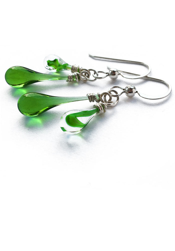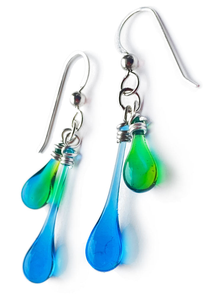 We use stained art glass or recycled bottle glass to make the droplets themselves. All wire and ear hooks are hypo-allergenic sterling silver, and the sterling silver wire is 100% recycled. Necklaces come on sterling silver chain.