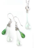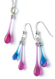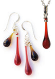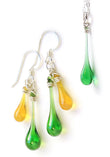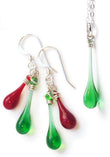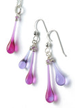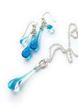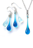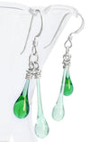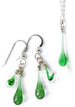 We use stained art glass or recycled bottle glass to make the droplets themselves. All wire and ear hooks are hypo-allergenic sterling silver, and the sterling silver wire is 100% recycled. Necklaces come on sterling silver chain.