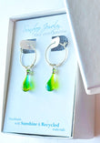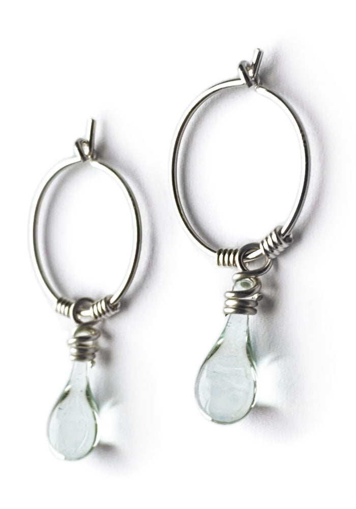 We use stained art glass or recycled bottle glass to make the droplets themselves. All wire and ear hooks are hypo-allergenic sterling silver, and the sterling silver wire is 100% recycled. Necklaces come on sterling silver chain.