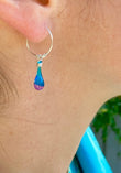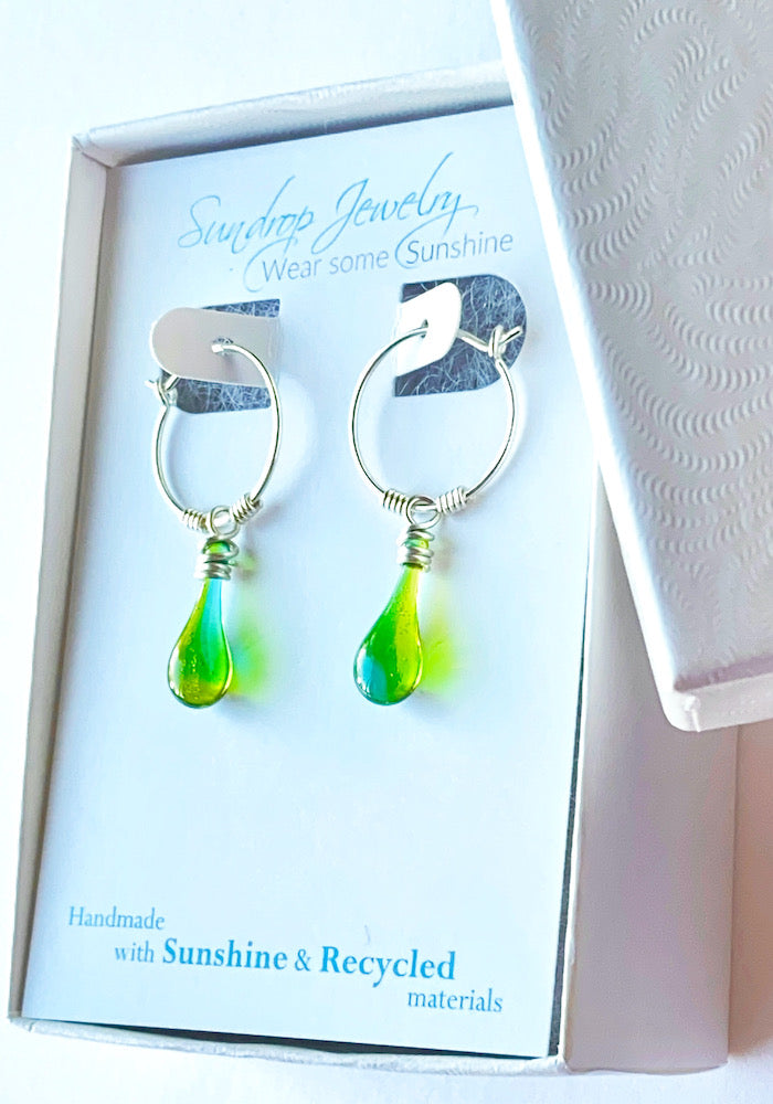 You are unique and original, and your jewelry should be too! Each drop of glass is handmade in the artist’s backyard studio in Berkeley, California. Using a giant magnifying glass to focus sunshine, recycled bottles and stained glass were melted into these translucent, flowing drops under the open sky! No pieces are exactly alike.