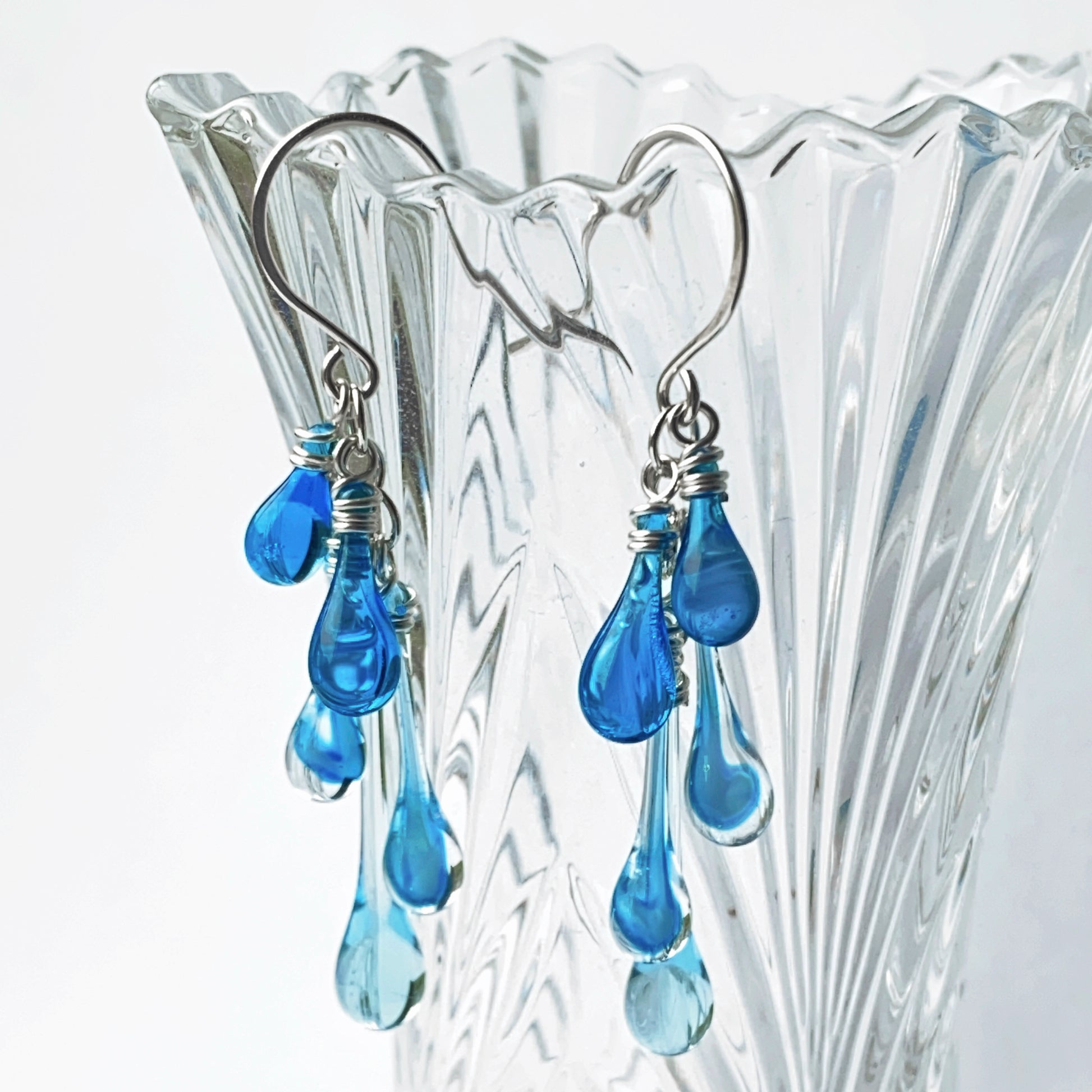 We use stained art glass or recycled bottle glass to make the droplets themselves. All wire and ear hooks are hypo-allergenic sterling silver, and the sterling silver wire is 100% recycled. Necklaces come on sterling silver chain.
